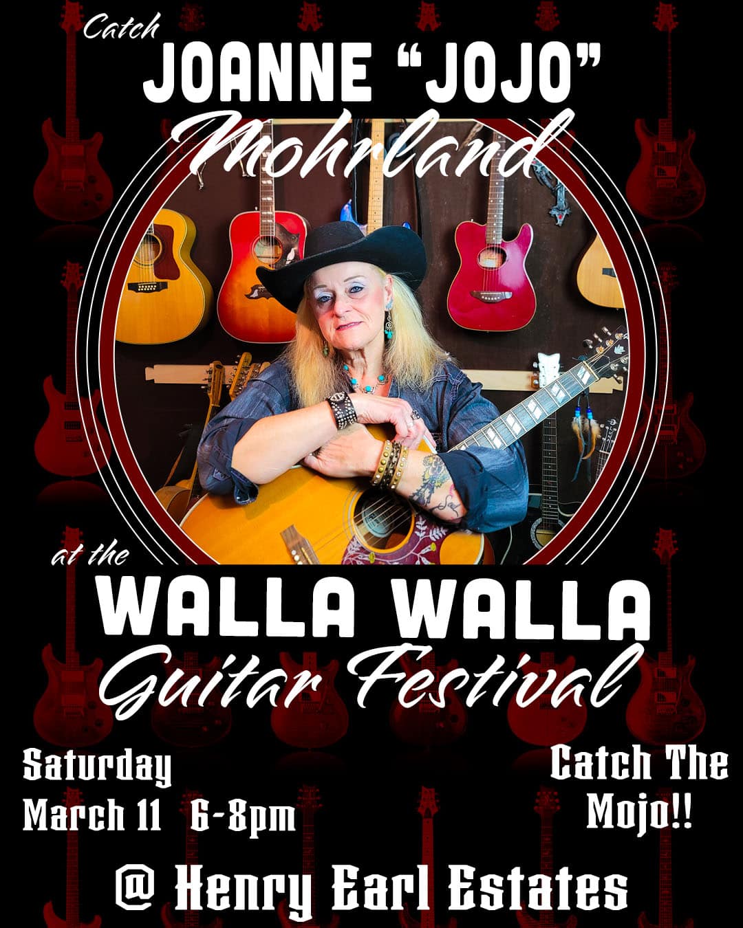 Catch JoAnne “JoJo” Mohrland performing at the 2023 Walla Walla Guitar Festival. She will be lighting up the Henry Earl Estates stage Saturday, March 11th from 6-8pm.